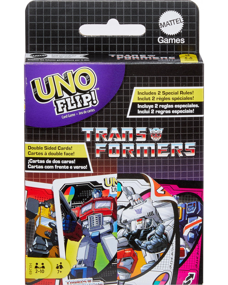UNO FLIP TRANSFORMERS™. ¡Prepárate para una batalla épica de cartas! El juego clásico ahora con gráficos de tus personajes favoritos de Transformers en películas, series de televisión y cómics. Compite y grita "UNO" para la victoria