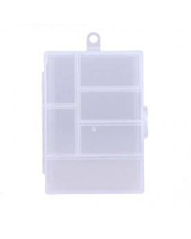 Caja organizadora de plástico (12 cm x 8 cm x 2 cm) con 6 compartimentos para guardar las fichas y figuras de tus juegos favoritos. El color del cierre puede ser distinto al de la imagen.