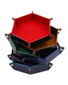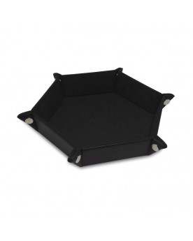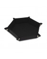 Bandeja de dados hexagonal de cuerina y paño, con broches en las 6 esquinas que facilitan el plegado y el despliegue.