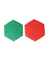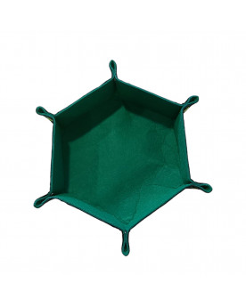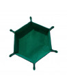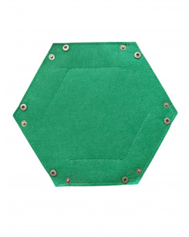 Bandeja de dados hexagonal de fieltro, con broches en las 6 esquinas que facilitan el plegado y el despliegue.