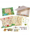 1 castillo de la Rana Escaladora, compuesto de: torres A y B, cartón plegable, estanque, 4 pinzas (para unir las diferentes partes) y 4 guías de cartón; 1 rana en 2 cordeles, con 2 bolitas de madera, 10 fichas-ventana con habitante, 20 cartas-cuadro, 10 bolas (los objetos de los habitantes), 1 reloj de arena, 1 instrucciones del juego.