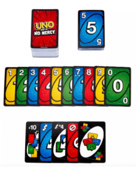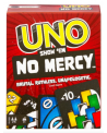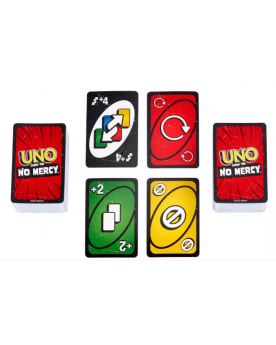 UNO Show 'em No Mercy es nuestro juego UNO más brutal hasta la fecha. Tiene un montón más de cartas con penalizaciones MUCHO más duras (¿alguien quiere robar 10 cartas?) y nuevas reglas que harán que los jugadores apilen, intercambien y roben más cartas que nunca. Incluso existe una Regla de Piedad (sí, entendemos la ironía) por si las cosas se ponen demasiado feas. Hay dos formas de ganar en esta despiadada versión del juego clásico: ¡deshacerse de todas las cartas expulsar a todos los demás jugadores de la partida! Ah, y si consigues quedarte con una sola carta, no olvides gritar "¡UNO!".