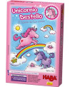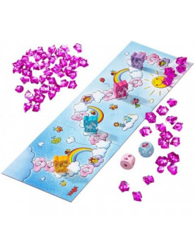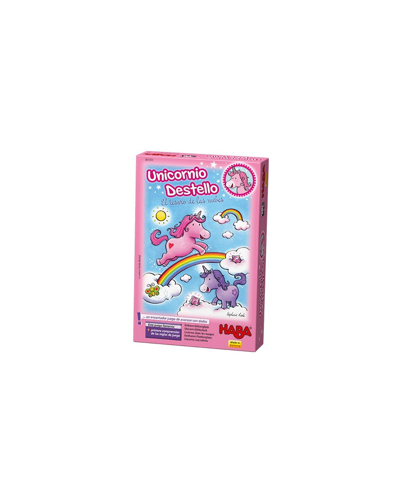 Contenido: 1 tablero de juego, 1 unicornio Destello de color rosa, 1 unicornio Astro de color amarillo, 1 unicornio Flor de color lila, 1 unicornio Espiral de color turquesa, 60 cristales de nubes, 1 dado de cristal de color rosa, 1 dado de nubes de color azul, 1 instrucciones del juego.