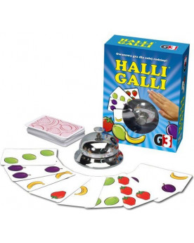 Un timbre en mitad de la mesa, un montón de cartas para cada jugador y en cuanto salgan exactamente cinco frutas del mismo tipo,¡cuidado! ¡es hora de ir a por el timbre! ¡y el más rápido será el vencedor de Halli Galli!
