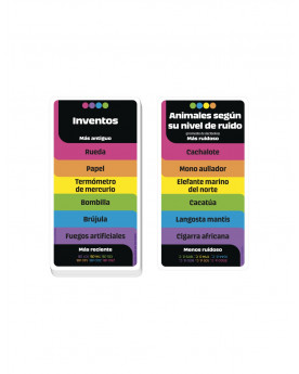 En el juego Trivia Lista, los jugadores tienen todas las respuestas, ¡solo deben colocarlas en el orden correcto! Este dinámico juego electrónico de preguntas se juega en apenas 15 minutos. Juega contra otro jugador o en equipos. En cada ronda, comienza colocando una carta de preguntas con 6 respuestas en la torre de juego. A continuación, cada equipo se turna para adivinar el orden correcto de las respuestas y acumular puntos. Por ejemplo, ordena 6 primeros álbumes desde el menos reciente al más reciente. Los jugadores ordenan sus respuestas insertando los discos en la torre y ganan puntos por cada respuesta correcta. Para vivir una experiencia como en los programas de juego, la torre guía a los jugadores de inicio a fin con comandos de voz y efectos de sonido. ¡Luego de 4 rondas, el equipo con más puntos será el ganador!