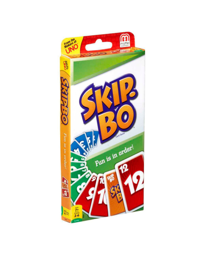 Skip Bo es un emocionante juego de cartas en secuencia de los creadores de UNO. Los jugadores muestran su gran habilidad para construir secuencias numéricas ascendentes, empezando desde el número 1, hasta que hayan agotado todas sus cartas. Los comodines añaden giros emocionantes al juego, ya que pueden ser utilizadas en cualquier momento. El jugador que logre terminar su reserva de cartas primero será el ganador. Incluye 162 cartas e instrucciones. Los colores y las decoraciones pueden variar.
