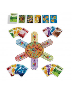 Las cartas por un lado muestran una provincia (y, en caso de jugarla, un jugador sumará puntos en esa provincia del tablero central) y por el otro muestra 1 de los cuatro grupos: militares, intriga, arquitectura y comercio, que darán distintas bonificaciones según la combinación final en la zona personal de cada jugador. Además, hay 14 cartas de dioses, que afectan el valor de puntuación de las provincias en el mapa central y que pueden dar un vuelco a la partida en cualquier momento.