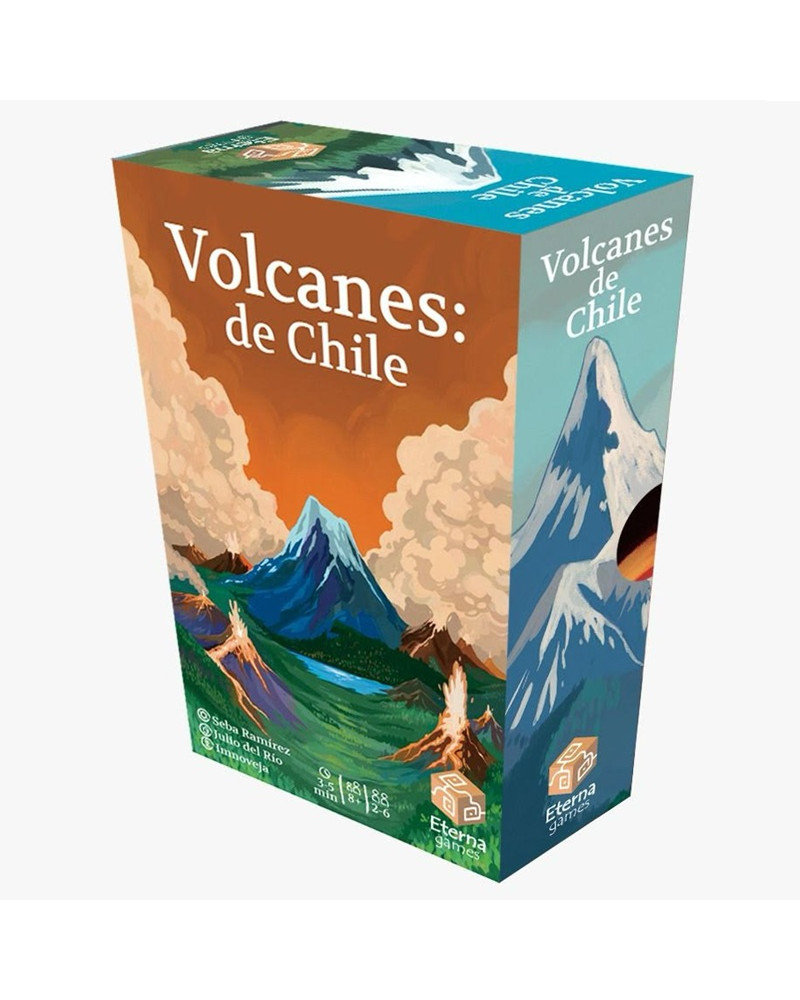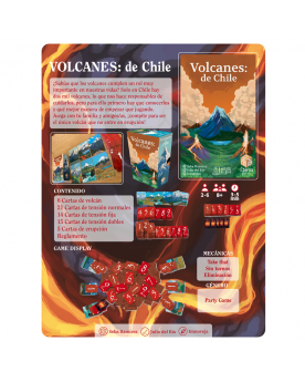 Volcanes de Chile es un juego sin turnos en el que cada persona tendrá un volcán chileno y deberán buscar cartas de tensión para jugar encima de los volcanes del resto hasta que entren en erupción. Las cartas de tensión son números del 1 al 9: las hay normales (que se devuelven a la mesa boca abajo si no te sirven), fijas (que las devuelves boca arriba si no te sirven) y dobles (que aceleran la tensión de algún volcán dos niveles con una sola carta). Finalmente, está la temida carta de erupción que sólo puede ser jugada en un volcán que está en nivel 9 de tensión.