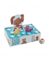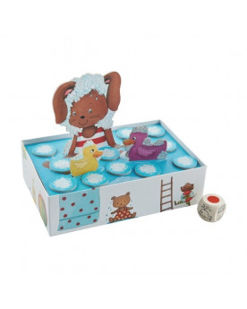 Contenidos: 1 bañera, 1 soporte de cartón en cruz, 1 superficie del agua, 1 Conejito Burbuja, 2 patos, 12 fichas, 1 dado, 1 instrucciones del juego.