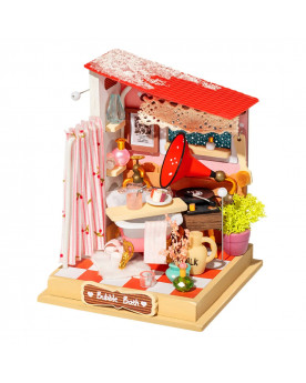 La Miniatura Armable Bubble Bath de Rolife Secret World es una pieza decorativa que recrea la escena de un adorable baño de burbujas, el cual puedes armar tú mismo. Es un baño precioso. Hay muchas cosas en color rosa, como la cortina de la ducha, las zapatillas, la toalla e incluso el bote de champú. Puedes disfrutar de una taza de té y un trozo de tarta mientras te bañas. Al lado de la bañera hay un tocadiscos antiguo. Puedes imaginarte dándote un baño en agua caliente con música. Una vez ensamblada, se puede utilizar como decoración especial para el hogar.